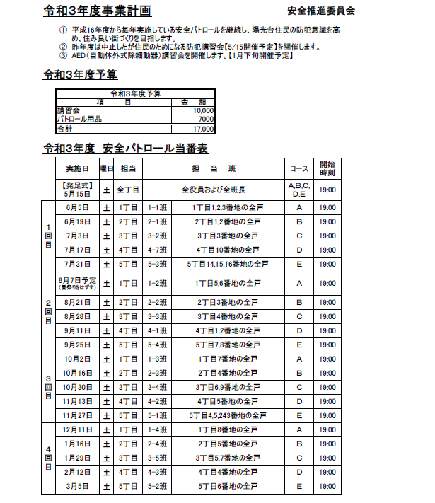 平成27年度安全パトロール予定表| 実施日 | 担当丁目 | 担当班 | コース | 開始時刻 | |