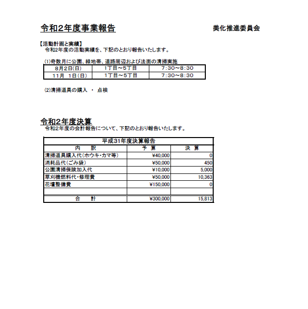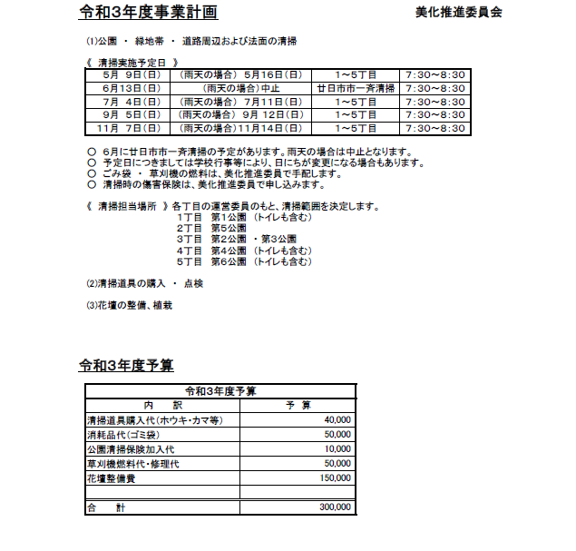 - ごみ袋/草刈機の燃料は、美化推進委員で手配します。